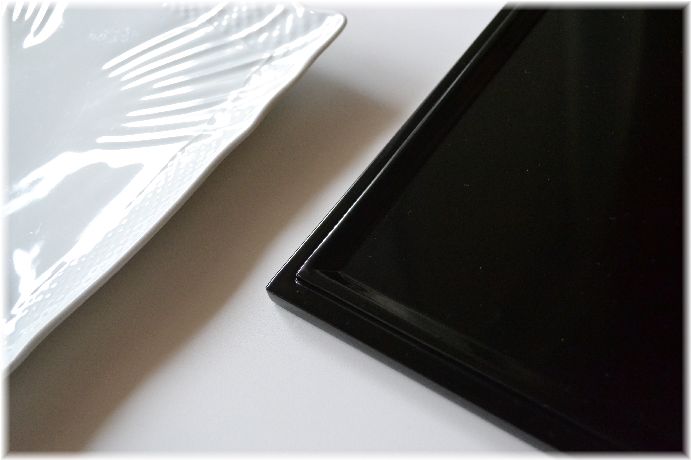 ★写真の器は、左がリチャード・ジノリのスクエアプレート、右は会津の塗師・義堂さんの黒塗角重の蓋です。どちらも24CM角のもの。